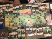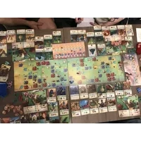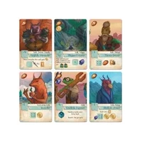 In Creature Caravan, players build a card tableau of creatures while traveling through a magnificent and dangerous land. Players take turns simultaneously, placing dice on actions on their cards, moving their caravan on the map, and playing new creature cards. Players also compete to trade goods and rare coins in a shared market, search the mysterious white towers, and fight ember zombies as they travel. The game ends when one player reaches Eastrey. The player with the most points wins.