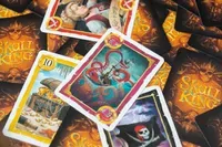 Skull King uses a 66-card deck that consists of five Escape cards, four suits numbered 1-13, two Mermaids, five Pirate cards, 1 Tigress card, and 1 Skull King card. The game lasts ten rounds, and in each round, each player is dealt as many cards as the number of the round. All players simultaneously bid on the number of tricks they think they'll take by holding out a fist and on the count of three revealing a certain number of fingers (or possibly a closed fist for a bid of zero tricks).