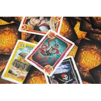 Standard rules apply for the playing of cards, with one player leading off a card and other players following suit, if possible, and playing something else if not; however, a player may always choose to play one of the special, unnumbered cards — and the power of those cards might let you win a trick that otherwise would have gotten away. In more detail, the black Jolly Roger suit trumps the other three suits, a Mermaid trumps all numbered cards, a Pirate trumps the Mermaid, and the Skull King trumps everything — except if he appears in the same trick with a Mermaid, in which case she captures him and wins instead. An Escape card loses to any other card, and the Tigress card serves as either a pirate or escape card as desired by the player. Whoever wins a trick leads in the next trick.